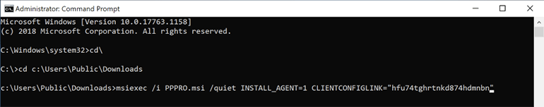 msiexec /i pppro.msi /quiet INSTALL_AGENT=1 PM_SERVICE=1 CLIENTCONFIGLINK="[CONFIGURATION LINK ID]"For example: