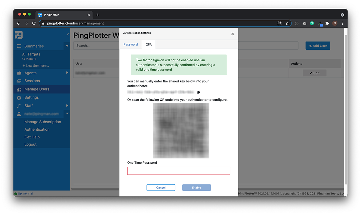 Two-factor authentication is enabled on a user-by-user basis. If you are an admin requiring 2FA to be enabled for PingPlotter Cloud, coordinate with your team to ensure each member has enabled 2FA on their accounts.