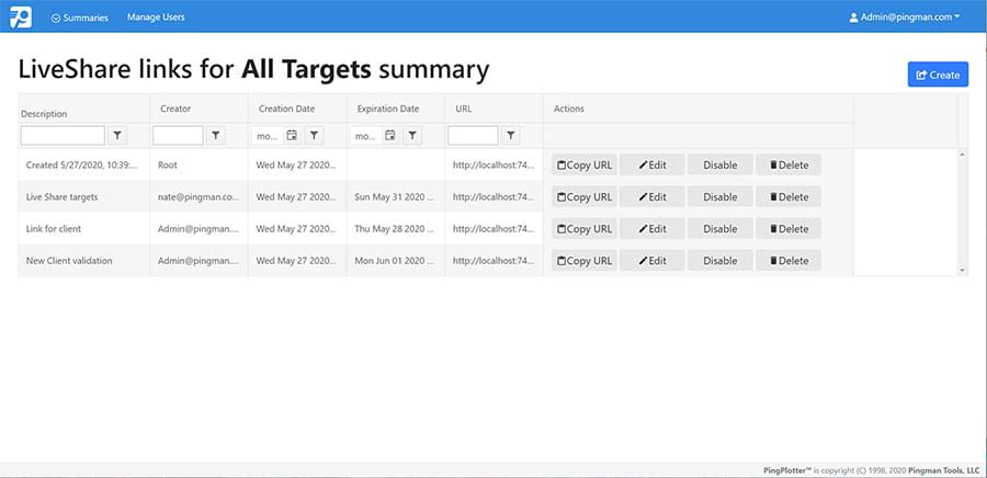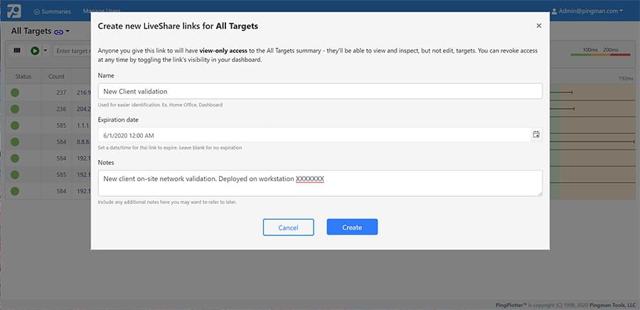 Once you’ve finished modifying your link settings, select Create, and PingPlotter will generate a LiveShare link URL.