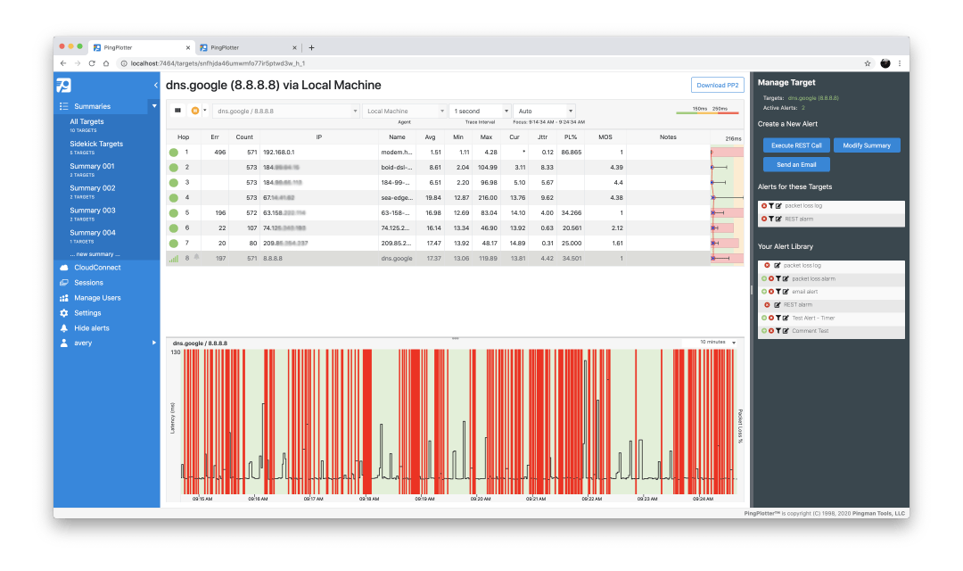 Start, pause, stop, and configure a PingPlotter trace to a specific IP address or DNS nameTarget summaries