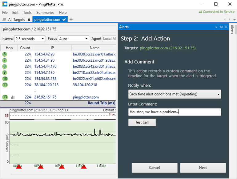 When you’re monitoring a route for extended periods, it’s important to keep track of major events. By creating an Add Comment alert action, PingPlotter will add a comment to any Timeline Graph as part of your alerts. Like a normal comment, it sticks with the graph when you export or share your PingPlotter data.