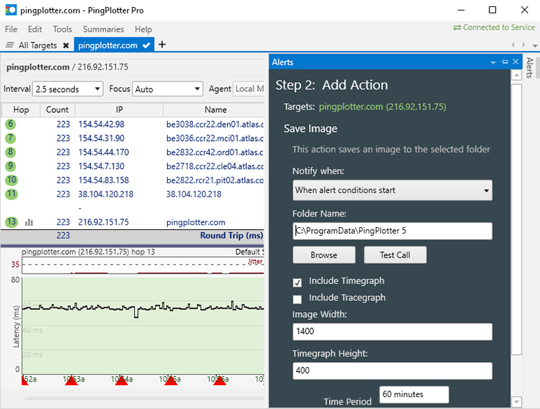 We’ve now added the option to save a screenshot of your PingPlotter data when an alert triggers. With the Save Image action, you can choose to capture your Trace Graph and Timeline Graph at the image size you set while choosing just how much data you want to show.