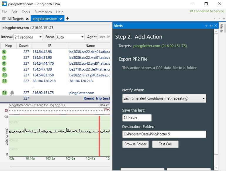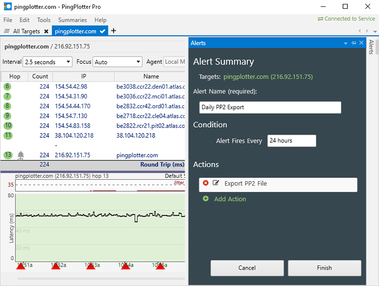 PingPlotter’s latest release brings more flexibility to your alerts. In addition to exporting PingPlotter trace data and triggering alerts at regular intervals, there are several new options to help automate your monitoring and troubleshooting work.