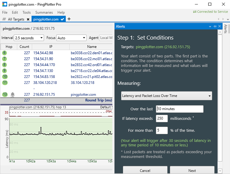 This makes building a case for your ISP or service client as simple as setting a condition, starting a trace, and letting PingPlotter snap a picture of your proof.