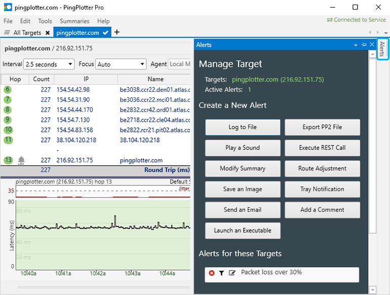 If you’re relatively new to PingPlotter, you may not have had a chance to use its expansive alert system. Alerts are automated actions PingPlotter can take when conditions like high latency or extended packet loss impact your network. As you can imagine, alerts are a huge help whether you’re troubleshooting an issue or monitoring performance.