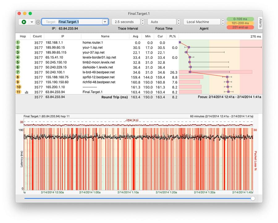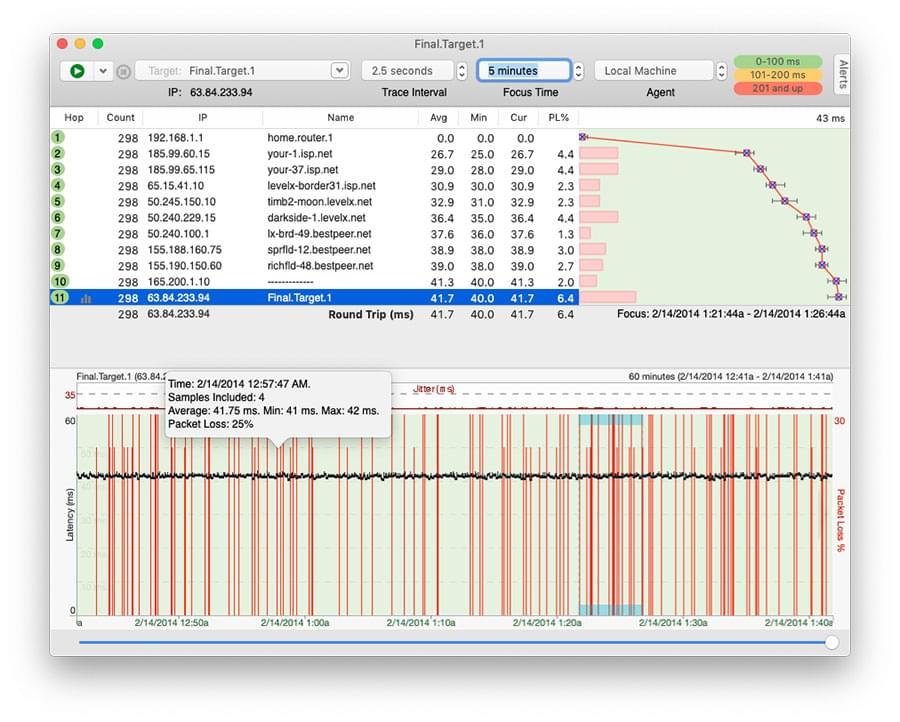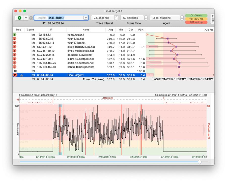 Next, make sure you can correlate your test data to the problem you’re experiencing. Running PingPlotter 24/7 never hurts, but you want to be making VoIP calls and watching for what PingPlotter shows when your issues manifest.