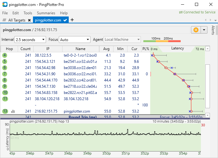 PingPlotter aggregates the raw data it collects and places it into scalable time series graphs. You can see network conditions before, during, and after an incident, be it seconds, hours, or even weeks. These graphs also visualize all the numerical data you would normally collect from ping and traceroute (and a few other important metrics ping and traceroute can’t get). Take this example: