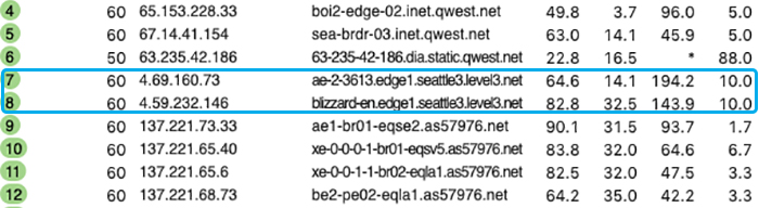 Notice that the web tool routes data through Los Angeles, while the test from our perspective routes through Seattle. If the Seattle hops were having issues, our web test would have missed them completely.