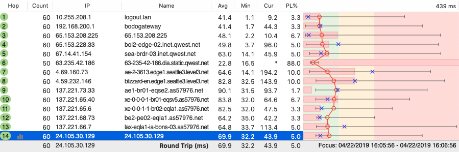 Let’s see what we find when we add some perspective. Here’s the same test conducted at the exact same time, but this one starts at our device and goes out to their server (we used PingPlotter for the trace because it’s prettier than a command line — it’s still the same test):