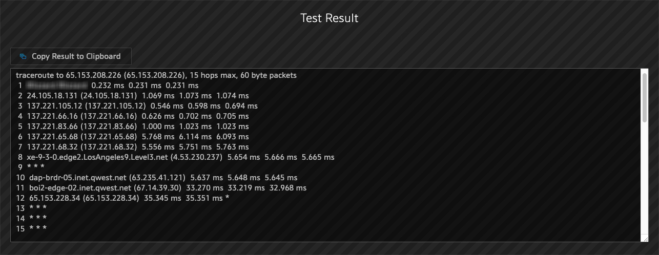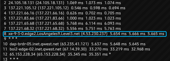 If you look closely, you may notice two things about our results. First, we have a complete route. Instead of wondering where or how the connection falls apart, we see every hop in full detail. If our issue lived in the first few hops, the web tool would have only hinted at it.